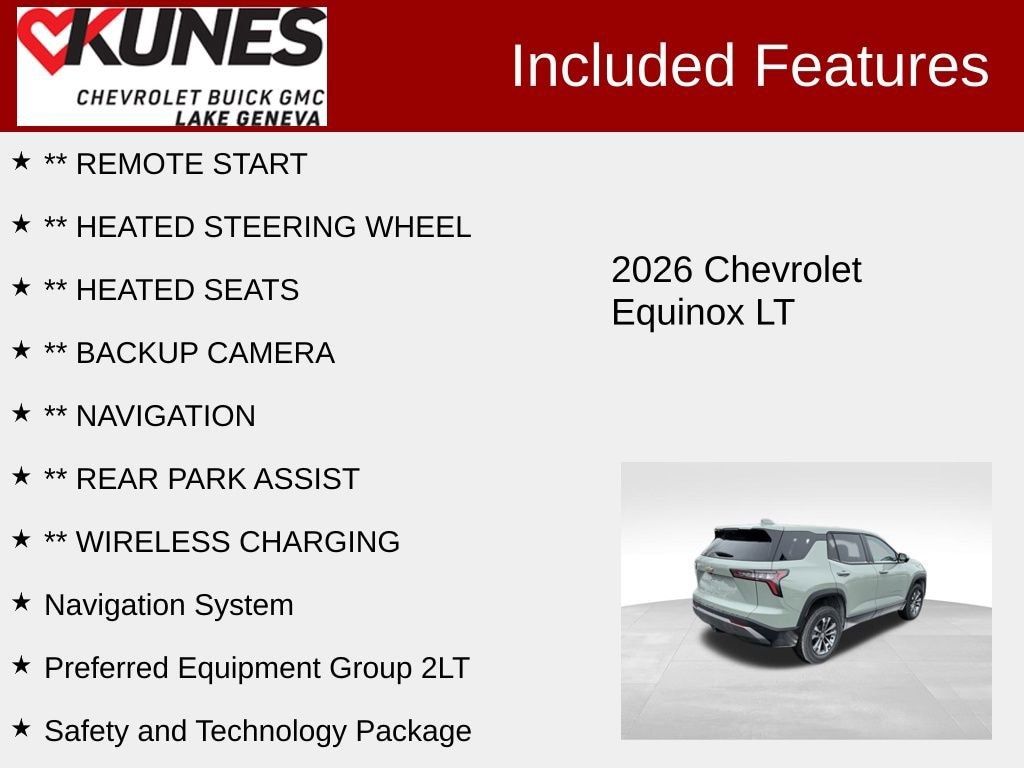 Elevate your driving experience with the 2026 Chevrolet Equinox LT. This SUV's blend of style, performance, and technology makes it a standout in its class. Visit our showroom today to experience the Equinox LT firsthand and discover why it's the perfect choice for your next adventure. Price includes: $500 - GM Rewards Card Sales Sign Up and Spend Offer. Exp. 06/30/2026 $750 - Chevrolet Purchase Loyalty Program. Exp. 03/02/2026