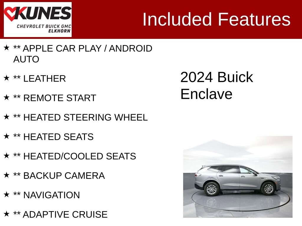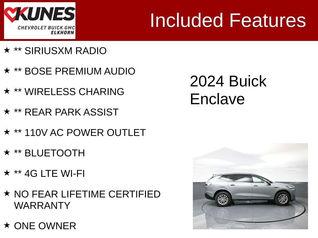 2024 Buick Enclave Premium Group 3.6L V6 SIDI VVT 9-Speed Automatic FWD Clean CARFAX. CARFAX One-Owner. 18/26 City/Highway MPG