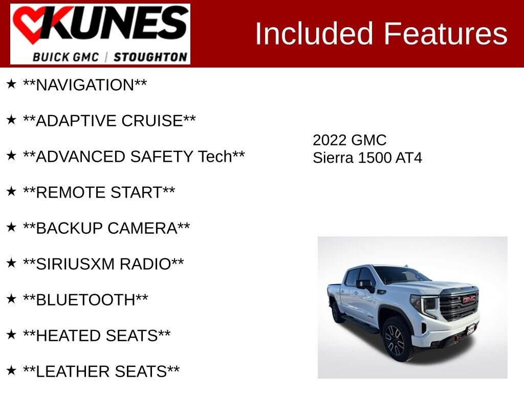 **NAVIGATION**, **ADAPTIVE CRUISE**, **ADVANCED SAFETY Tech**, **REMOTE START**, **BACKUP CAMERA**, **SIRIUSXM RADIO**, **BLUETOOTH**, **HEATED SEATS**, **LEATHER SEATS**, **4 WHEEL DRIVE**, **PUSH BUTTON/KEYLESS START**, **RUNNING BOARDS**, **TONNEAU COVER**, **BEDLINER**, **FULL 4 DOOR CREW CAB**, 10-Speed Automatic, 4WD, Jet Black w/Kalahari Accents w/Perforated Front Leather Seat Trim, 10-Way Power Driver Seat Adjuster w/Lumbar, 10-Way Power Passenger Seat Adjuster w/Lumbar, 120-Volt Bed Mounted Power Outlet, 120-Volt Instrument Panel Power Outlet, 2 Charge/Data USB Ports Inside Center Console, 2 Type-C Charge-Only Rear USB Ports, 2 USB Ports, 220 Amp Alternator, 3.23 Rear Axle Ratio, 7 Speakers, Adaptive Cruise Control, AM/FM radio: SiriusXM with 360L, AT4 Preferred Package, Auto-Locking Rear Differential, Automatic Emergency Braking, Automatic temperature control, Black Chrome Header & Grille Insert Bars, Block heater, Bumpers: body-color, Color-Keyed Carpeting Floor Covering, Compass, Deep-Tinted Glass, Delay-off headlights, Driver door bin, Driver vanity mirror, Electric Rear-Window Defogger, Electrical Steering Column Lock, Emergency communication system: OnStar and GMC Connected Services capable, Engine Block Heater, Floor-Mounted Center Console, Following Distance Indicator, Front Bucket Seats, Front Center Armrest, Front dual zone A/C, Front Prem Floor Liners w/Removable Carpet Insert, Front Rainsensing Wipers, Front wheel independent suspension, Fully automatic headlights, GMC Connected Access Capable, HD Rear Vision Camera, Heated 2nd Row Outboard Seats, Heated Driver & Front Outboard Passenger Seating, Heated front seats, Heated rear seats, Heated Steering Wheel, Heated steering wheel, Heavy-Duty Air Filter, Hill Descent Control, Hitch Guidance, Hitch Guidance w/Hitch View, Illuminated entry, In-Vehicle Trailering App, Integrated Trailer Brake Controller, Keyless Open & Start, LED Cargo Area Lighting, Low tire pressure warning, Not Equip w/Heat & Vent Seat Cushion Blower Motor, Not Equipped w/Steering Column Lock, Occupant sensing airbag, Off-Road High Clearance Step (LPO), Off-Road Suspension, OnStar & GMC Connected Services Capable, Overhead airbag, Overhead console, Passenger door bin, Passenger vanity mirror, Perforated Front Leather Seat Trim, Perimeter Lighting, Power Door Locks, Power Front Passenger Windows w/Express Up/Down, Power Front Windows w/Driver Express Up/Down, Power passenger seat, Power Rake & Telescoping Steering Column, Power Rear Windows w/Express Down, Power Sliding Rear Window w/Rear Defogger, Preferred Equipment Group 4SB, Premium audio system: GMC Infotainment System, Premium Bose 7-Speaker Sound System, Push Button Start, Radio: Premium GMC Infotainment Audio System, Rear Prem Floor Liners w/Removable Carpet Insert, Rear reading lights, Rear seat center armrest, Rear Wheelhouse Liners, Rear window defroster, Red Recovery Hooks, Remote Vehicle Starter System, Safety Alert Seat, SiriusXM w/360L, Speed control, Speed-sensing steering, Split folding rear seat, Spray-On Pickup Bed Liner w/AT4 Logo, Steering Wheel Audio Controls, Tachometer, Telescoping steering wheel, Theft Deterrent System (Unauthorized Entry), Tilt steering wheel, Trailering Package, Trip computer, Universal Home Remote, Variably intermittent wipers, Ventilated Driver & Front Passenger Seats, Ventilated front seats, Voltmeter, Wi-Fi Hotspot Capable, Wireless Charging, Wireless Phone Projection. Priced below KBB Fair Purchase Price! AT4