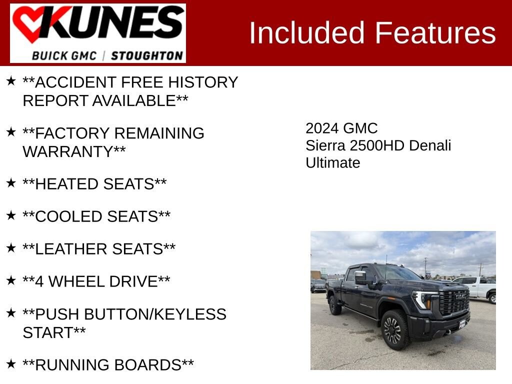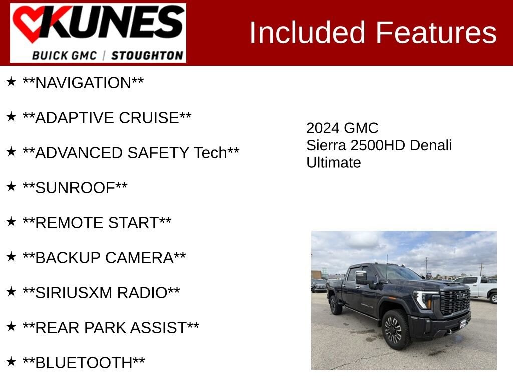 **NAVIGATION**, **ADAPTIVE CRUISE**, **ADVANCED SAFETY Tech**, **SUNROOF**, **REMOTE START**, **BACKUP CAMERA**, **SIRIUSXM RADIO**, **REAR PARK ASSIST**, **BLUETOOTH**, **ACCIDENT FREE HISTORY REPORT AVAILABLE**, **FACTORY REMAINING WARRANTY**, **HEATED SEATS**, **COOLED SEATS**, **LEATHER SEATS**, **4 WHEEL DRIVE**, **PUSH BUTTON/KEYLESS START**, **RUNNING BOARDS**, **BEDLINER**, **FULL 4 DOOR CREW CAB**, 10-Speed Automatic, 4WD, Alpine Umber w/Full Grain Leather Seat Trim, 120-Volt Bed Mounted Power Outlet, 120-Volt Instrument Panel Power Outlet, 16-Way Power Passenger Seat Adjuster w/Lumbar, 2 Charge-Only Rear USB Ports, 2 Charge/Data USB Ports Inside Center Console, 2 USB Ports, 2-Speed Active Transfer Case, Bed View Camera w/2 Trailer Camera Provisions, Bose Premium Series 12-Speaker System, Buckle to Drive, Bumpers: body-color, Compass, Deep-Tinted Glass, Delay-off headlights, Driver door bin, Driver vanity mirror, Electric Rear-Window Defogger, Emergency communication system: OnStar and GMC connected services capable, Floor-Mounted Center Console, Front Bucket Seats, Front Center Armrest, Front Prem Floor Liners w/Removable Carpet Insert, Front Rain-Sensing Wipers, Front reading lights, Front wheel independent suspension, Full Grain Leather Seat Trim, Fully automatic headlights, Genuine wood dashboard insert, Genuine wood door panel insert, GMC Connected Access Capable, Gooseneck/5th Wheel Prep Package, HD Surround Vision, Heated 2nd Row Outboard Seats, Heated Driver & Front Outboard Passenger Seats, Hill Descent Control, Illuminated entry, Inside Rearview Auto-Dimming Rear Camera Mirror, Integrated Trailer Brake Controller, Keyless Open & Start, LED Cargo Area Lighting, LED Smoked Amber Roof Marker Lamps, Low tire pressure warning, Manual Tilt-Wheel/Telescoping Steering Column, Max Trailering Package, Multicolor 15 Diagonal Head-Up Display, OnStar & GMC Connected Services Capable, Outside temperature display, Overhead console, Passenger vanity mirror, Pickup Box, Power Front Passenger Windows w/Express Up/Down, Power moonroof, Power Sliding Rear Window w/Defogger, Power Sunroof, Preferred Equipment Group 5SB, Push Button Start, Rain sensing wipers, Rear Cross Traffic Alert, Rear reading lights, Rear Wheelhouse Liners, Remote Vehicle Starter System, Safety Alert Seat, Signature Denali Grille in Vadar Chrome, SiriusXM w/360L, Speed-sensing steering, Split folding rear seat, Spray-On Bedliner w/Denali Logo, Steering Wheel Audio Controls, Tachometer, Technology Package, Telescoping steering wheel, Tilt steering wheel, Trailer Cam Provisions & Trailer Viewing Software, Trailer Side Blind Zone Alert, Trailer Tire Pressure Monitor Sensors, Trip computer, Turn signal indicator mirrors, Ultrasonic Front & Rear Park Assist, Unauthorized Entry Theft-Deterrent System, Universal Home Remote, Ventilated Driver & Front Passenger Seats, Ventilated front seats, Voltmeter, Wheels: 20 Ultra-Bright Machined Aluminum, Wireless Charging, Wireless Phone Projection, X31 Off-Road Package. Odometer is 1930 miles below market average! Denali Ultimate