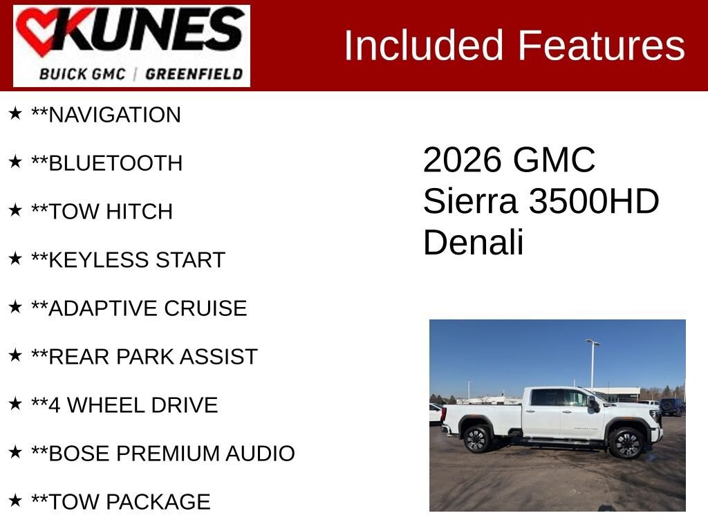 Glacier White 2026 GMC Sierra 3500HD Denali 4D Crew Cab 4WD 10-Speed Automatic Duramax 6.6L V8 Turbodiesel