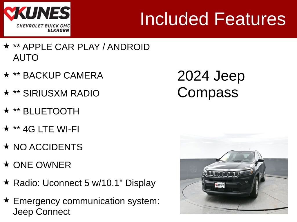 2024 Jeep Compass Latitude 2.0L I4 DOHC 8-Speed Automatic 4WD Clean CARFAX. CARFAX One-Owner. Odometer is 10131 miles below market average! 24/32 City/Highway MPG
